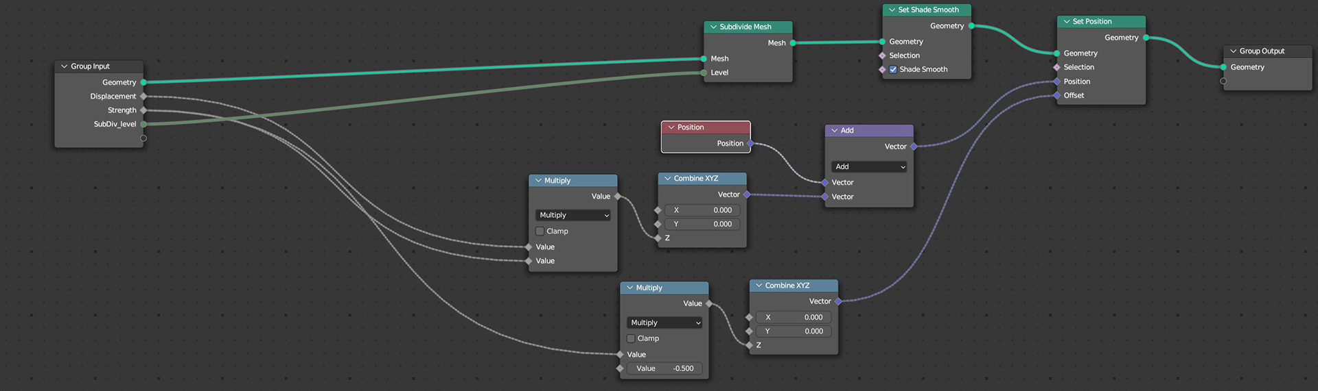 The node system allows me to draw a Bezier curve as a base for the path. Using a geometry proximity node and, within "NodeGroup.004" (pictured below), a set position node and a subdivide node I am able to control the width, depth and smoothness of the path. Black and white colour ramps are then used to control the gradient between the path and the rest of the plain and the blending between the grass and the path.