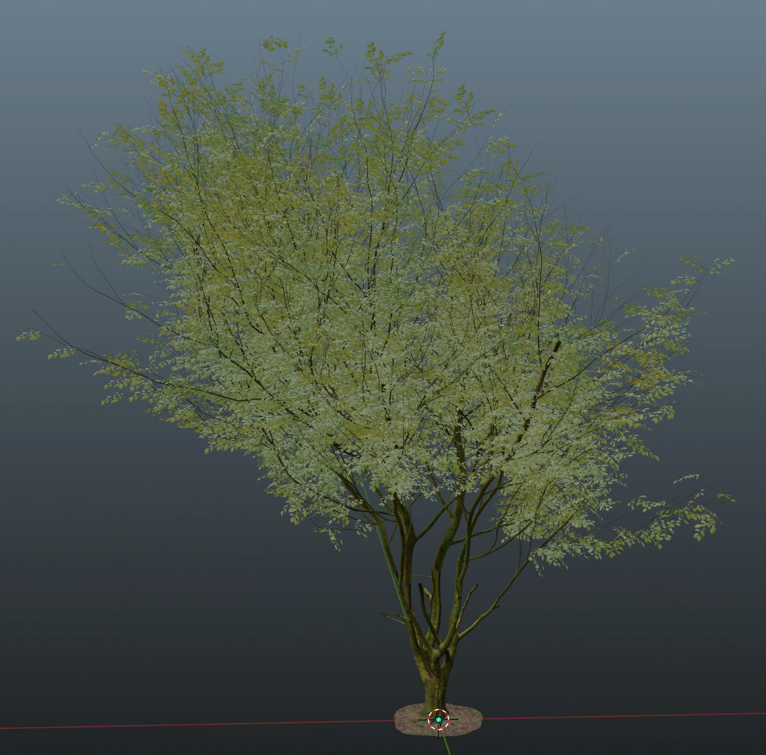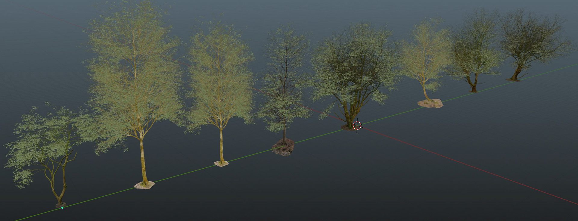 Finally, I repeated this process (reusing node systems and shaders where possible) to create a collection of trees for this scene and to potentially be reused as and when needed. (Below)