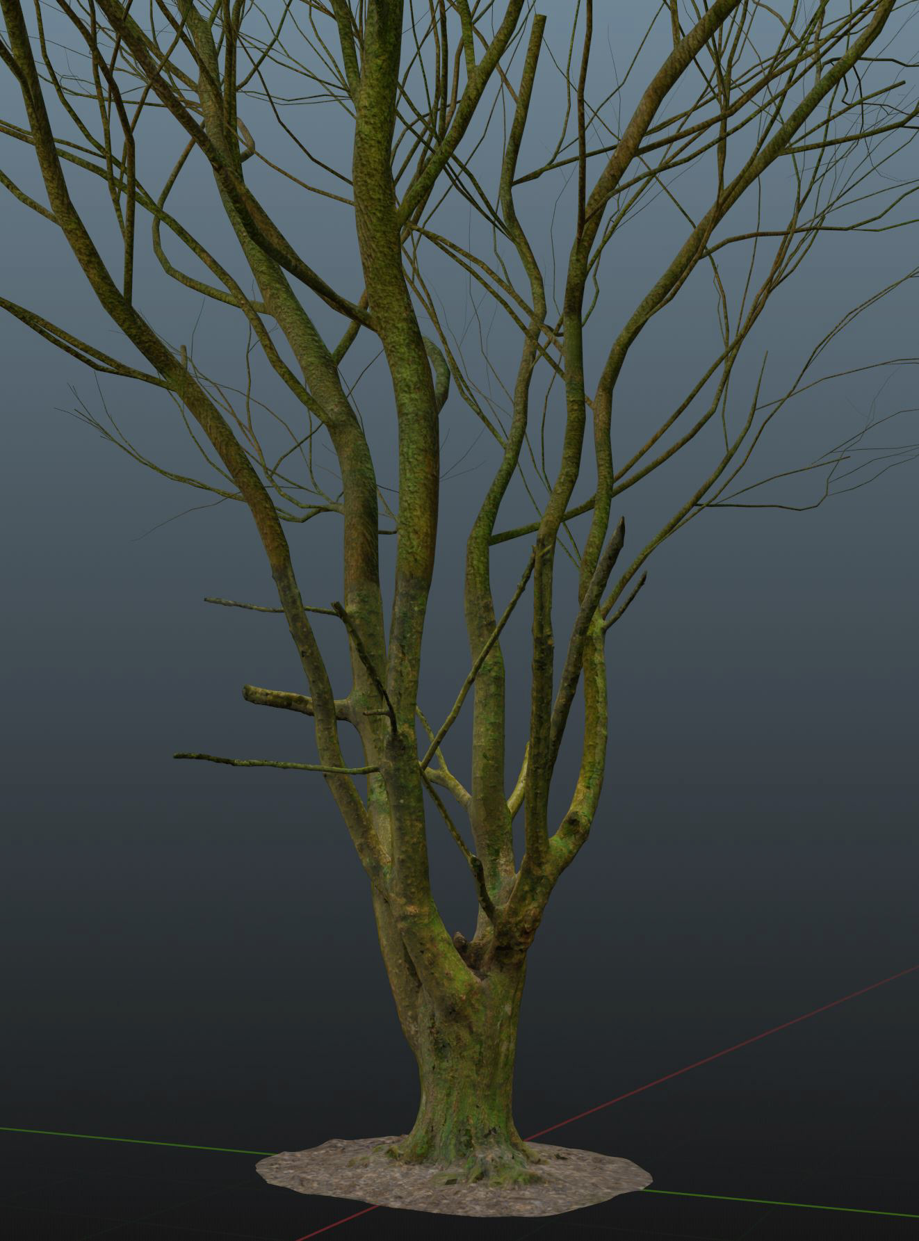 The trees were created by using a photo scanned tree trunk for the bottom halves and the Mtree Generator addon for Blender for the top half. the two halves were then joined together and sculpted to smoothen out the transition.