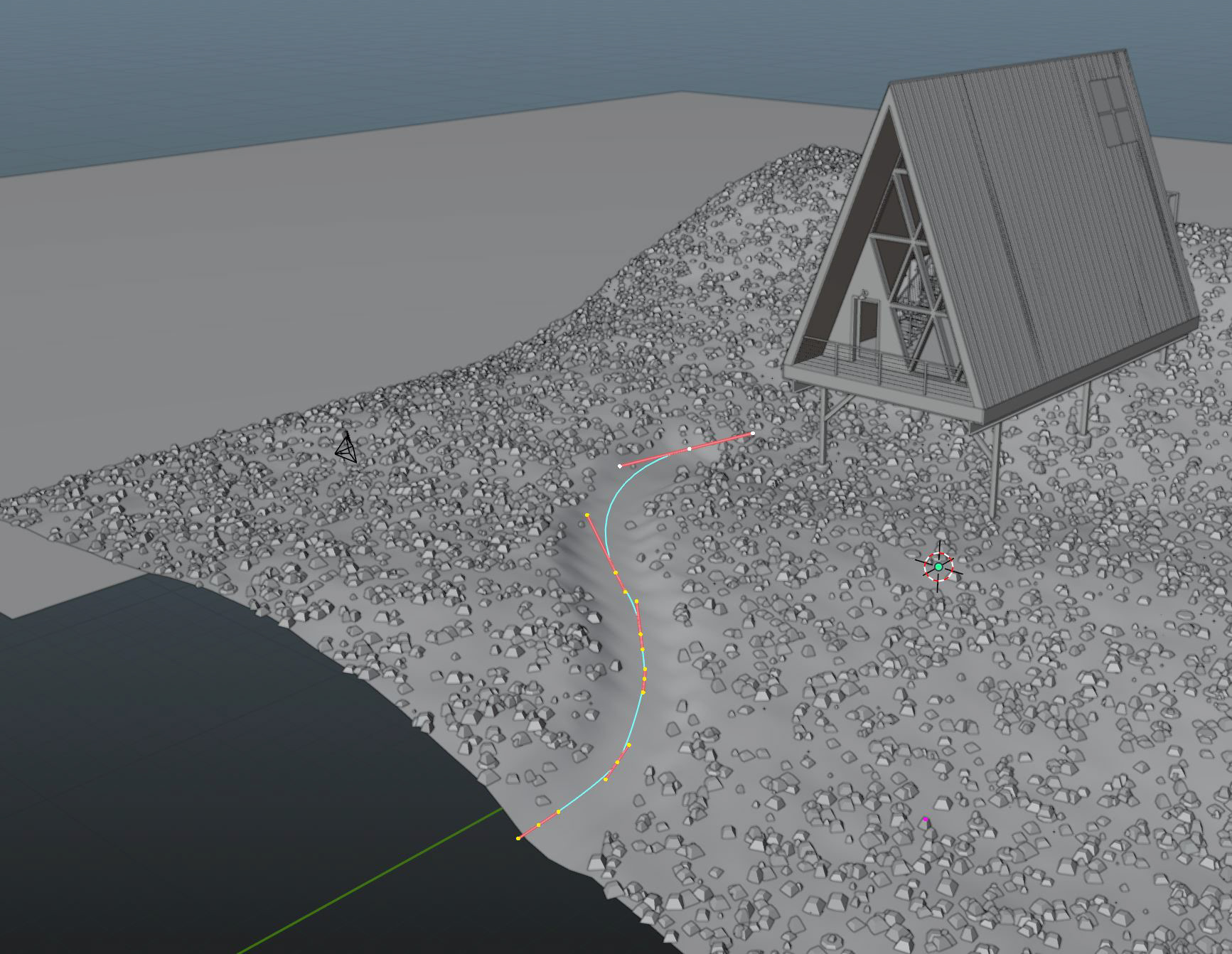 The path generator was created by adding a node graph (pictured above) as a modifier in conjunction with my existing grass node system.